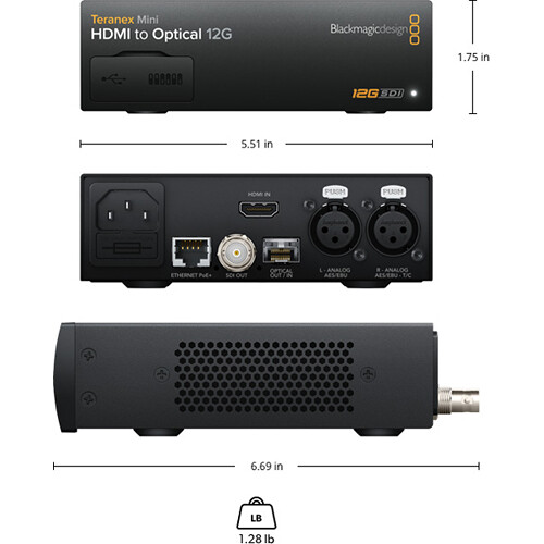 El conversor Teranex Mini HDMI a óptico 12G de Blackmagic Design permite convertir una señal HDMI a una salida 12G-SDI o instalar un módulo de fibra óptica opcional para convertir la señal HDMI a fibra. En ambos casos, la salida se ajustará automáticamente a la resolución de entrada HDMI. Admite una resolución de hasta DCI 4K (4096 x 2160) 60p tanto en la entrada como en la salida.