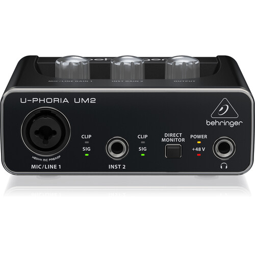 Captura tu mejor interpretación con la Behringer UM2 , una interfaz de audio USB 2x2 para grabar instrumentos de micrófono, línea e Hi-Z en tu ordenador. La UM2 está equipada con un preamplificador de micrófono XENYX alimentado a +48 V que ofrece una calidad excepcional, comparable a la de los preamplificadores de micrófono de gama alta.
